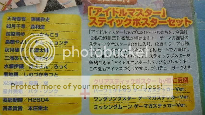 12 of the posters are drawn by different illustrators and the remaining 3 using the illustrations from the Gemaga iM@S PSP sticker)
