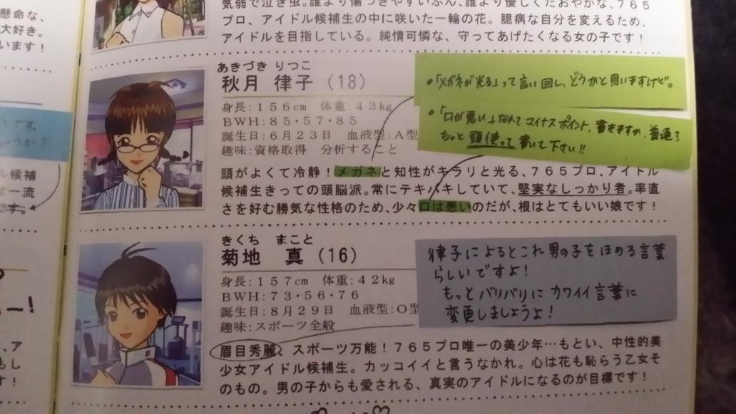 Here are some photos from an arcade era Producer's Guide. Photos from user "ゼロP@㌏㌰㌏㌰㌍㌧♪ @akizero12zero" on twitter. I'll translate them later. I found the idols comments on their own profiles amusing. I really like how their personalities come off through the writing styles and comments.